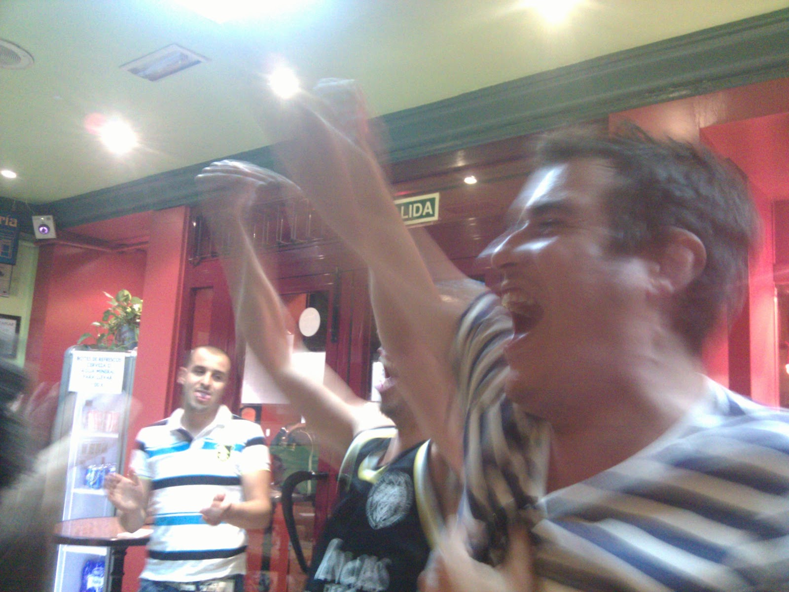 Finalmente, para el resto del partido convencí a mi partenaire de cambiar La casa de las navajas (del horror) por otro sitio. ¡Y aquí sí que encontramos lo que buscábamos! Puedo decir que de verdad lo pasé bien viendo fútbol, qué griterío, qué compadreo, qué gusto de revoltijo de gente, amigos: jóvenes tatuados y chuzos abrazados a jubilados con trompeta con toda la pinta de que jamás en sus casas les hubieran permitido disfrutar de semejante verbena (a los jubilados, claro).